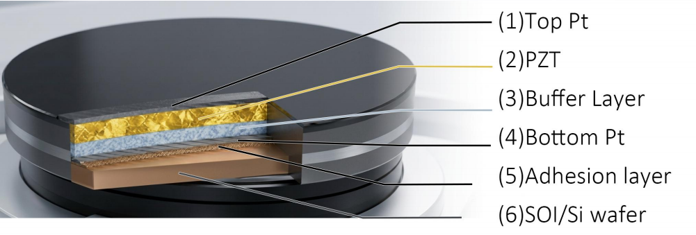 Integralność stosu wielowarstwowego ma fundamentalne znaczenie dla wydajności ferroelektrycznej. W naszych waflach zastosowano precyzyjnie zaprojektowany stos metalowych elektrod i cienkich warstw ceramicznych: