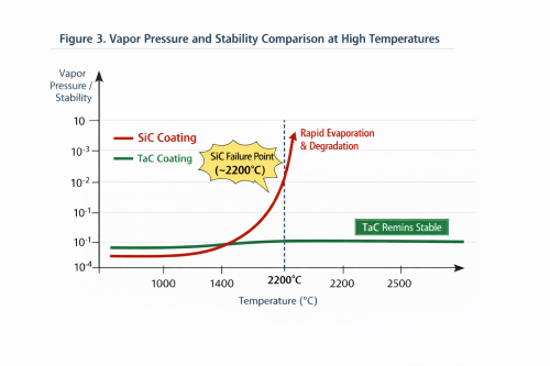 Niezrównana stabilność termodynamiczna: węglik tantalu (TaC) może poszczycić się zdumiewającą temperaturą topnienia wynoszącą 3880°C. Według badań opublikowanych w czasopiśmie Journal of Crystal Growth powłoki SiC ulegają „niekongruentnemu odparowaniu” w temperaturze powyżej 2200°C, gdzie krzem sublimuje szybciej niż węgiel, co prowadzi do degradacji strukturalnej i zanieczyszczenia cząstkami. Natomiast prężność pary TaC wynosi od 3 do 4o rzędy wielkości mniejsze niż SiC, utrzymując nieskazitelne pole termiczne dla wzrostu kryształów.